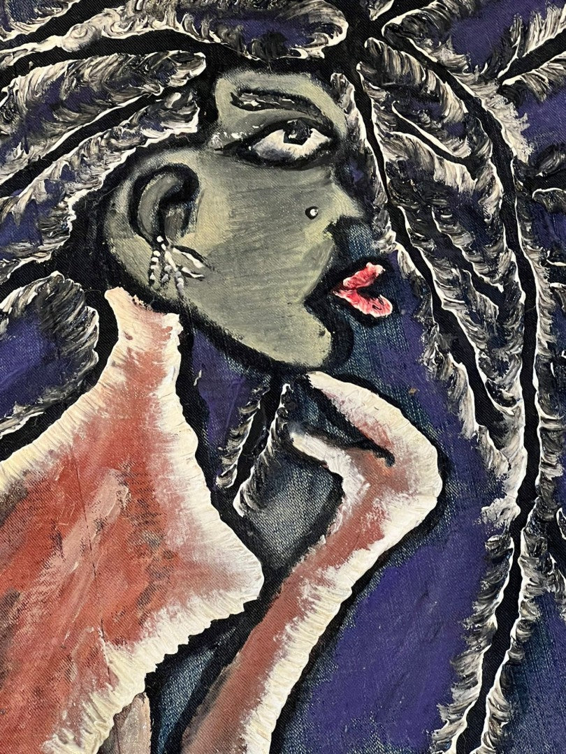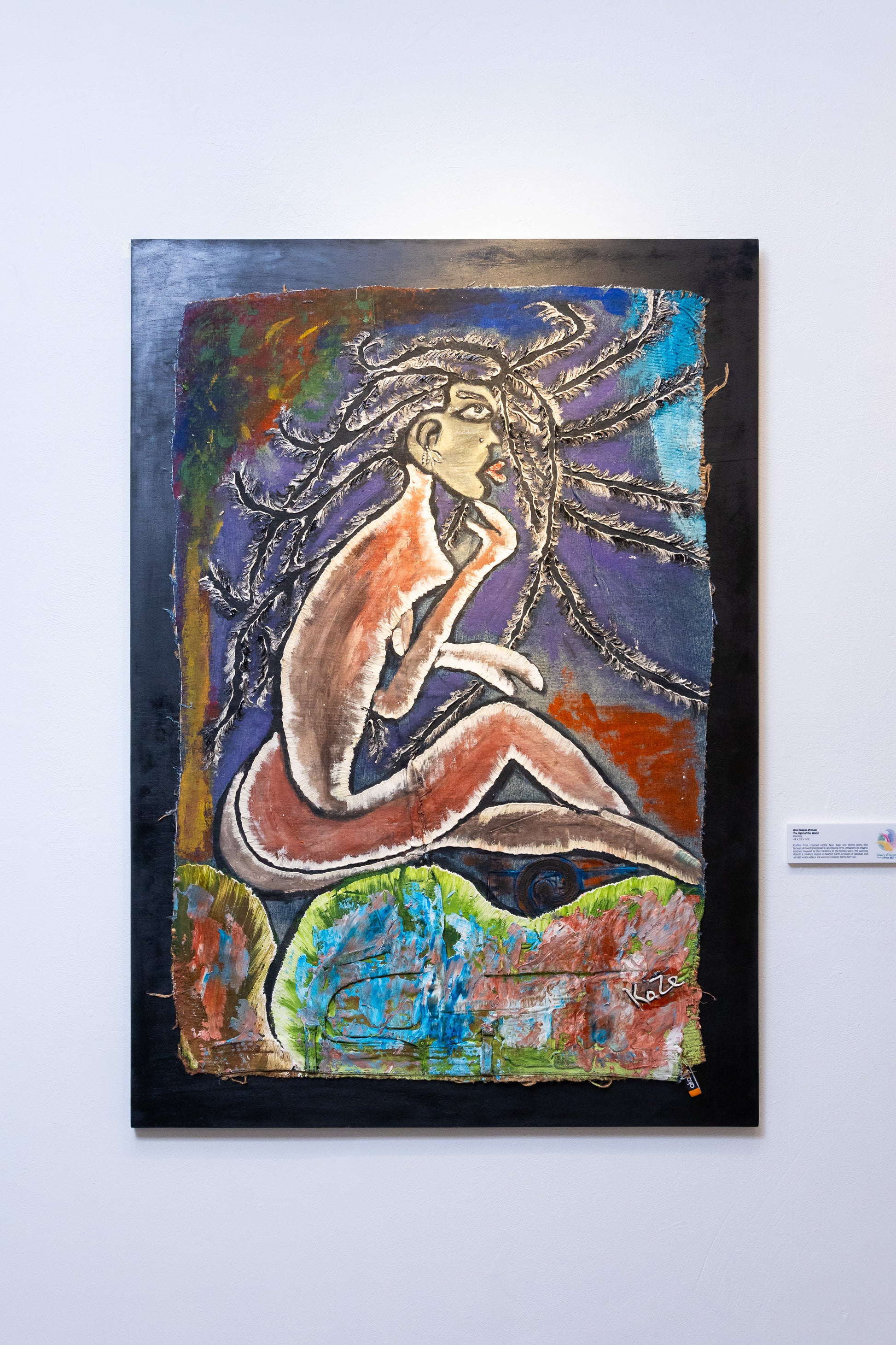 Crafted from recycled coffee bean bags and denim jeans, the lacquer, derived from Baobab and Hevea trees, enhances its organic essence. Inspired by the resilience of the human spirit, the painting depicts a creature seated on Mother Earth, a fusion of spiritual and secular vision where the wind of creation forms her hair.
